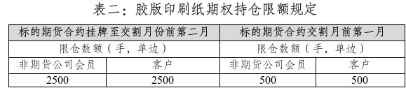 膠版印刷紙期權(quán)合約中,合約月份涉及的標(biāo)的期貨持倉量閾值為5000手(單邊)。
